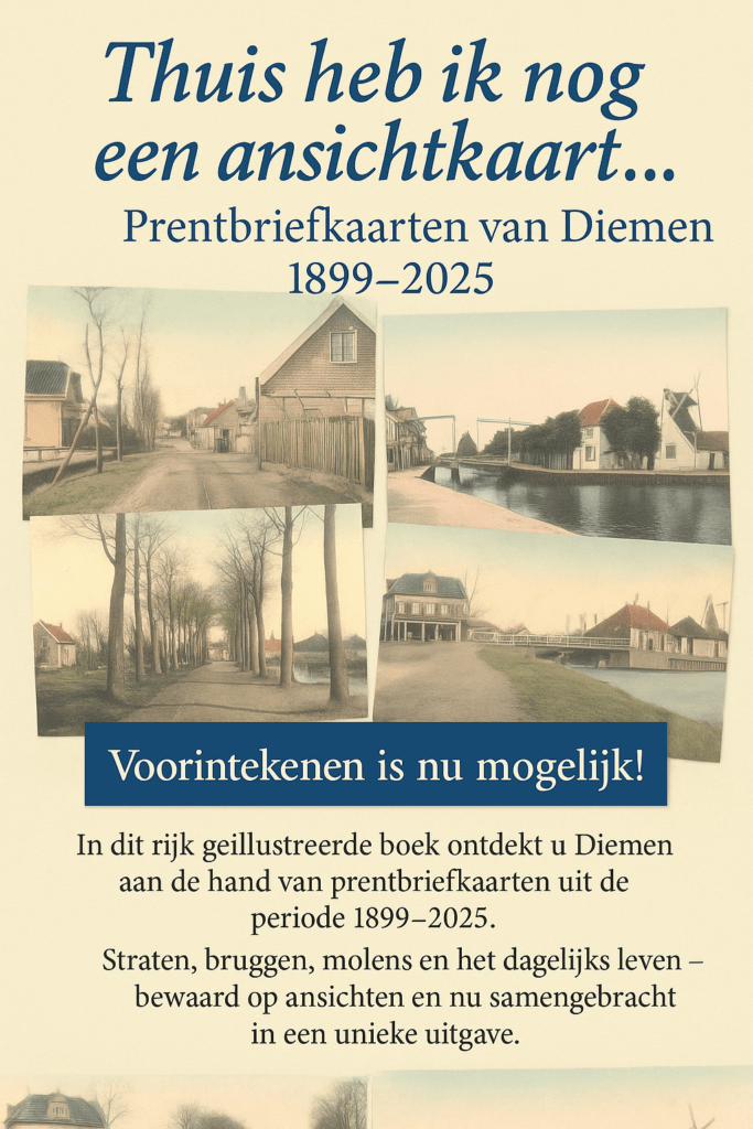 De prentbriefkaarten vindt u in het boek “Thuis heb ik nog een ansichtkaart ….Prentbriefkaarten van Diemen 1899-2025″, en is samengesteld door Wiard Krook en Taco ten Dam. Daarin zijn honderden prentbriefkaarten van Diemen in beeld gebracht. Met dit boek maakt u een fascinerende reis door de tijd met veranderingen van Diemen. Dit alles in groot formaat en in […]
